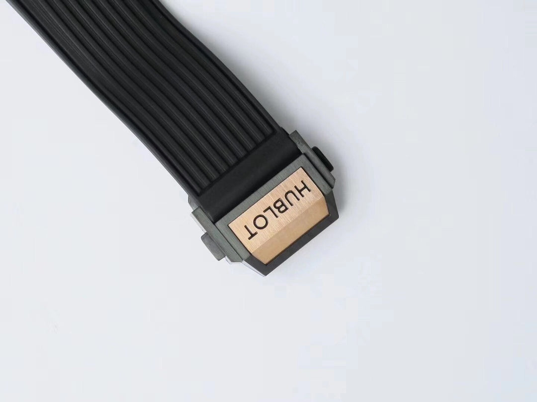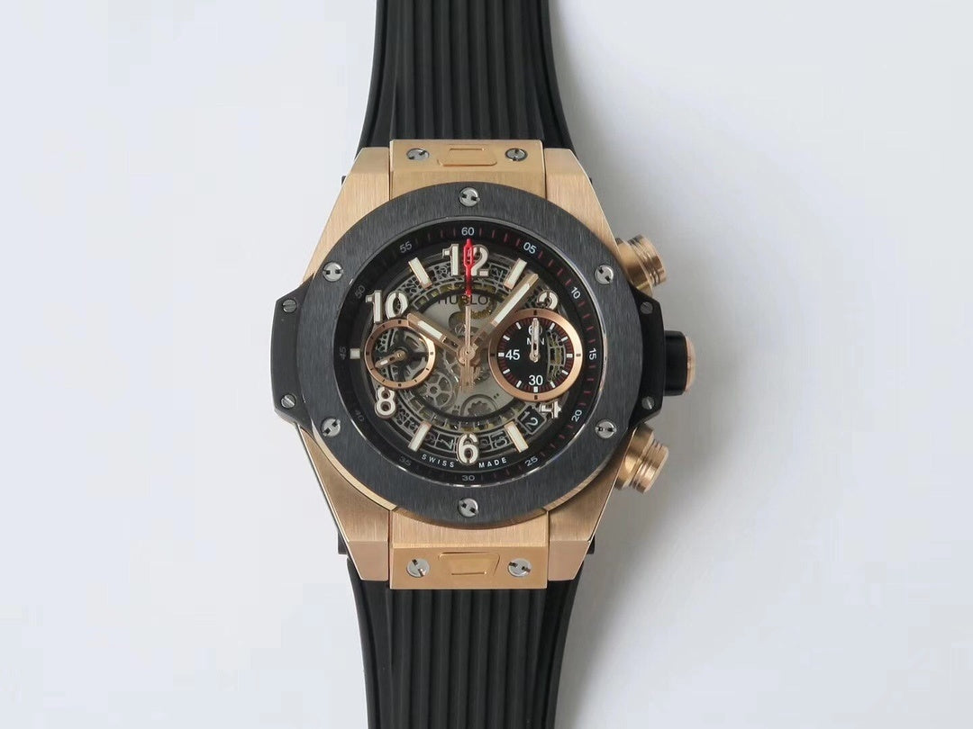 Introducing the Hublot Big Bang Chronograph in King Gold – a bold fusion of luxury and innovation. The skeleton dial reveals the intricate mechanics within, while the striking black ceramic bezel contrasts perfectly with the warm gold case. Enhanced with a chronograph function and finished on a durable black rubber strap, this timepiece embodies Hublot’s spirit of “Art of Fusion.” A watch that combines strength, elegance, and cutting-edge craftsmanship, designed for those who appreciate both performance and prestige.